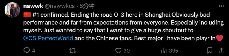 “CN #1确认!以0-3的战绩结束了上海之行,显然发挥非常糟糕,而且和大家的预期相差甚远,尤其是包括我在内。只想说要给主办方和中国粉丝点个大大的赞。这是我参加过最棒的Major。”