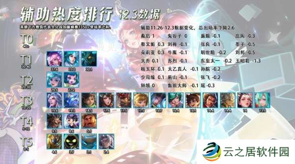 这一周辅助的热度几乎都没什么变化,毕竟也没有改动涉及到辅助,也没有新皮肤。下面我们来讨论一个很有意思的话题,大家都知道现在三大软辅朵莉亚,大乔和少司缘,他们也是当前版本仅有的三个T0辅助,那这三个英雄哪一个在路人局是最强最好用的呢?