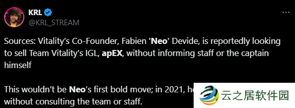 KRL:“据报道,Vitality的联合创始人Neo正在寻求出售Vitality的队内指挥apEX,而并未告知队员或队长(apEX)本人。