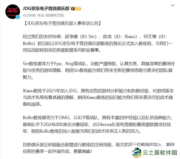 JDG俱乐部官宣全新教练组:Sin、Xiasu、BoBo将在下赛季辅佐Cvmax