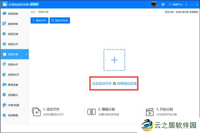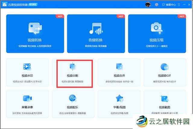 第一步 打开【迅捷视频剪辑软件】,进入首页,看到【视频分割】选项,点击选择。
