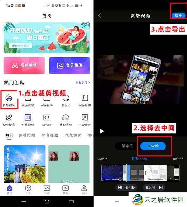 打开软件,点击【裁剪视频】选项,然后上传保存在相册的视频文件,点击【去中间】。滑动选择好需要删除的部分,选择好之后,点击【导出】即可实现视频的裁剪。
