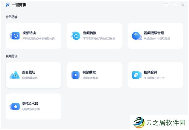 听到这款软件的名字,我们除了知道它是一款剪辑软件之外,还知道它的操作比较简单。是的,我们打开软件,可以看到软件的页面十分简洁,显示着软件的几个功能。我们可以进行视频转换、视频截取、画面裁剪、视频合并与视频加水印这些视频剪辑的操作。