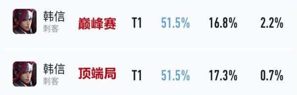 随着玩家逐渐重视起韩信新增的超级横扫,再加上“末世苍穹流”玩法成为主流,使得韩信的热度节节攀升,近期巅峰赛和顶端局均有51.5%胜率。