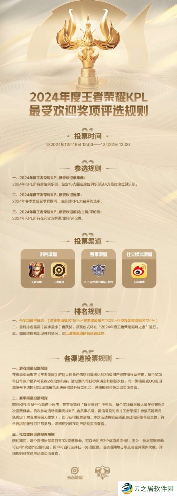各奖项最终排名=游戏渠道排名*50%+赛事渠道排名*30%+社交媒体渠道排名*20%,最终排名最高(数字最小)者获奖,颁奖仪式将在“2024年度王者荣耀巅峰之夜”进行。
