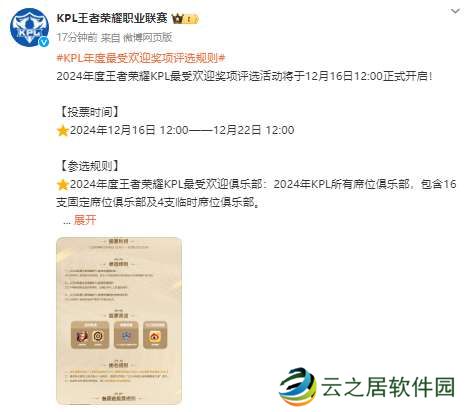 2024年度王者荣耀KPL最受欢迎奖项评选活动将于12月16日12:00正式开启!