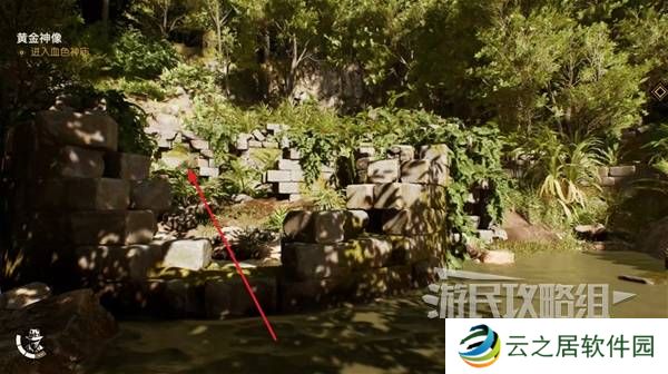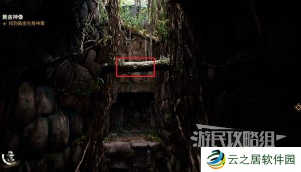 楼梯上方的机关砖块就在楼梯口的位置,解除机关直接过去拿黄金神像触发剧情。