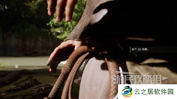 前往道路中断,与上方的树桩互动使用长鞭移动到另一边。