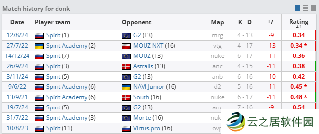 其中0.36 Rating为donk加入Spirit之后的生涯第二低,他生涯最低Rating为0.34 Rating,是在IEM科隆2024 A组败者组首轮对阵G2时创造,当时绿龙以0-2不敌G2遭遇淘汰。