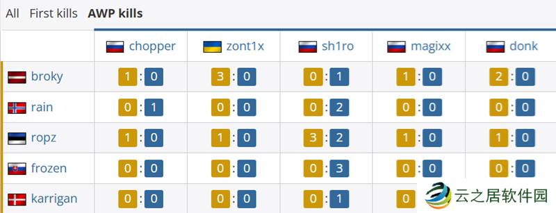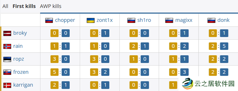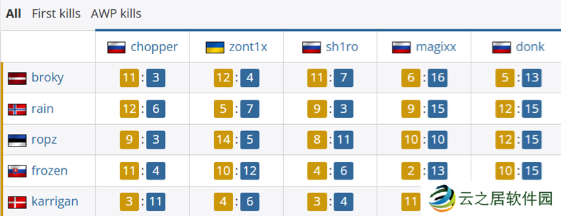 在全部对位数据上,donk全面压制FaZe选手,magixx除了和Robin Kool | ropz平分秋色之外,对于其他FaZe选手也占据优势。