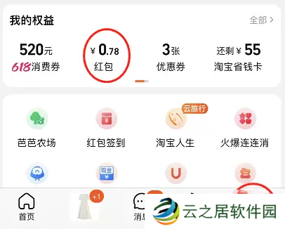 1、进入淘宝,点击右下角的【我的淘宝】,在我的权益这一栏可以看到【红包】;