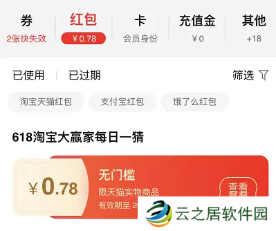 2、点击进入在红包的选项里面可以看到【618淘宝大赢家每日一猜】的无门槛红包,红包是有使用时间限制的大家记得及时使用哦。