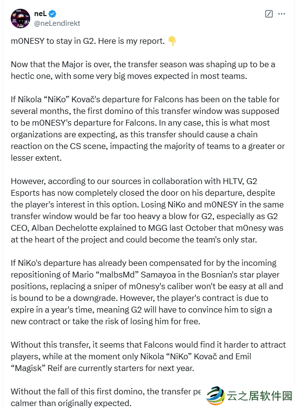 如果NiKo加盟Falcons的消息已经传出几个月,那么这个转会窗口的第一个多米诺骨牌原本应该是m0NESY加盟Falcons。大多数战队都预期这一变动将会发生,因为它将对CS圈产生深远影响,几乎所有队伍都将受到不同程度的波及。