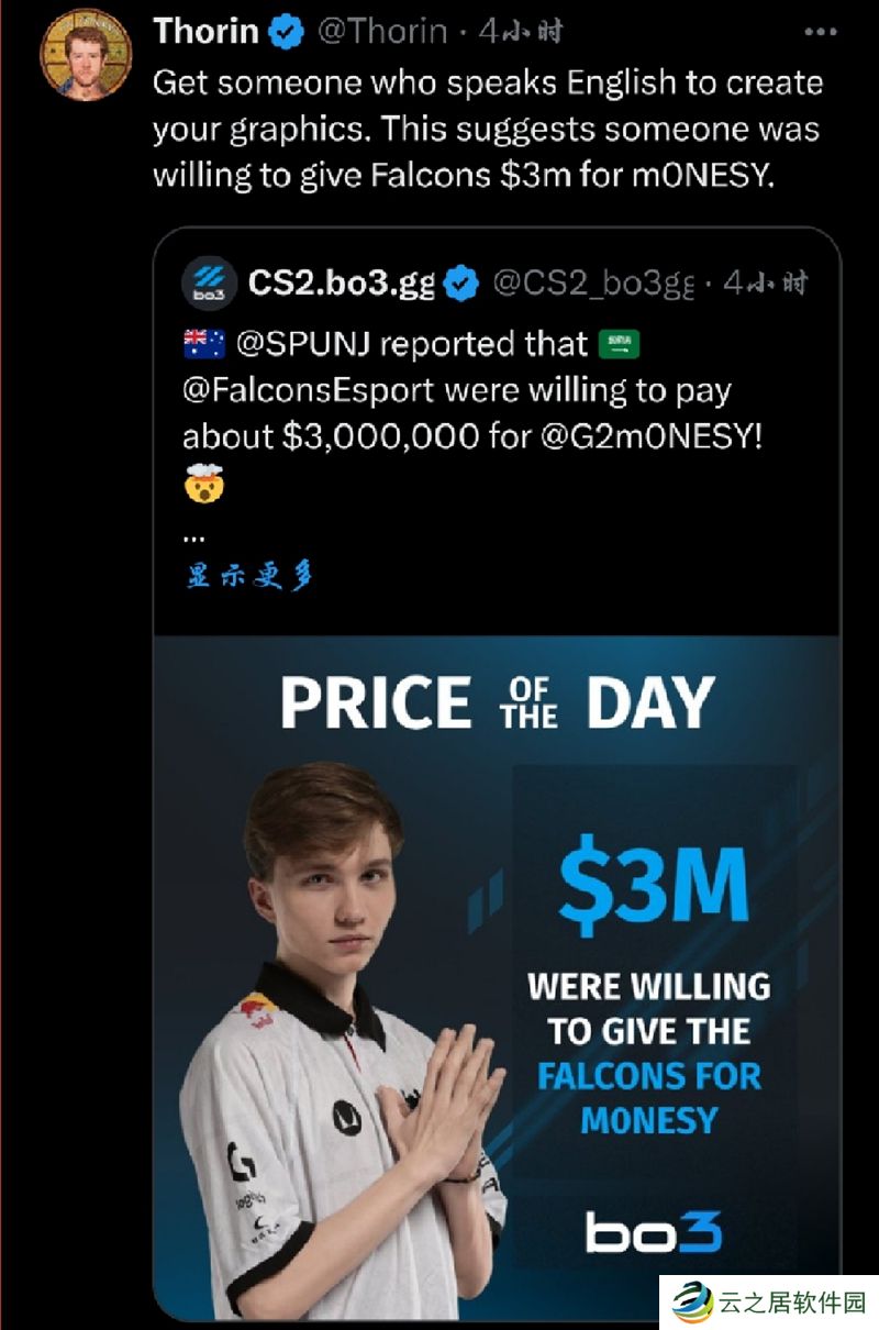但仔细一看这张图片我们可以发现,上面的英文出现了明显的错误:按照它上面的翻译,应该为“愿意用三百万美金从Falcons那里买下m0NESY”,这显然是错误的。对此,电竞记者Thorin也是找到了错误并评论: