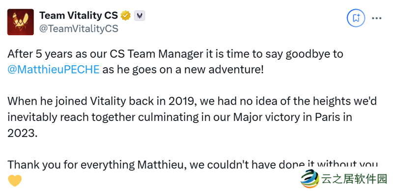 日前Vitality俱乐部在社交平台上宣布同战队CS经理MatthieuPECHE分手。