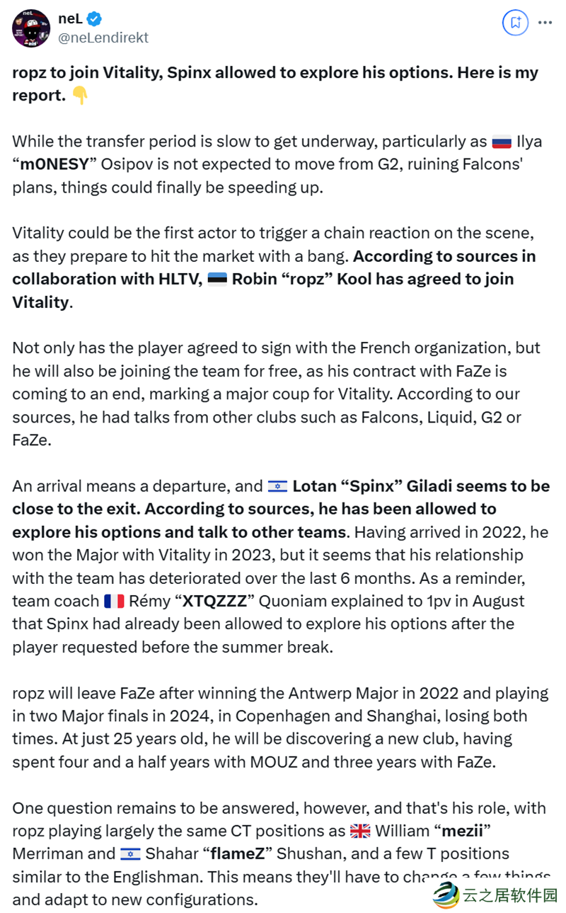 有新成员加入就意味着有成员离开,Spinx似乎即将离队。据消息人士表示,他已被允许寻求其他选择并与其他战队进行接触。他于2022年加入Vitality战队,并在2023年随队赢得了Major冠军,但在过去6个月里,他与战队的关系似乎已经恶化。值得一提的是,战队教练XTQZZZ今年在8月向法国媒体解释说,在Spinx于夏季休赛期前提出请求后,后者就已被俱乐部允许寻求其他选择。