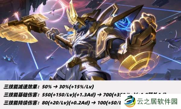 大招减速效果从50%调整至30%-60%,大招上调基础伤害和等级成长,AD加成改为额外AD加成。