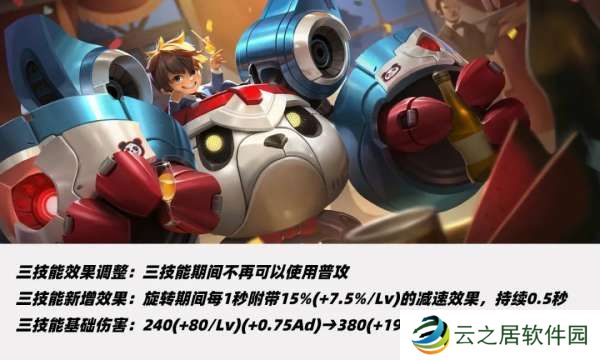 使用大招期间禁用普攻,大招旋转期间新增每秒附带15%-30%的减速效果、持续0.5秒。