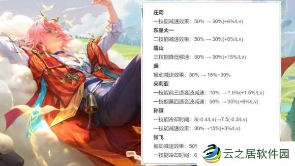 庄周一技能、东皇太一二技能和盾山三技能:减速从50%调整至30%-60%。