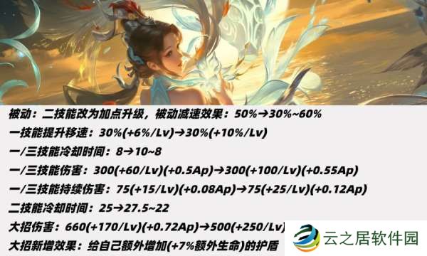 ②一三技能基础伤害上调0.05Ap加成、持续伤害上调0.04AP加成,四技能上调0.18Ap加成。