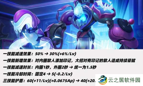 ①一技能减速从50%调整至30%-50%,内外圈减速时间统一为1.5秒,一技能冷却前期增加1秒、满级不变。