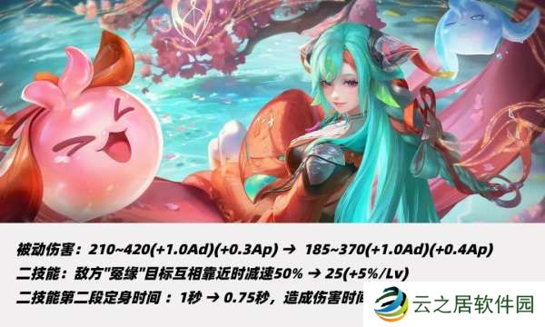被动减速从50%调整至25%-50%,强化普攻伤害上调20点伤害和0.1AP加成,二技能冷却前期不变、满级缩短1秒。