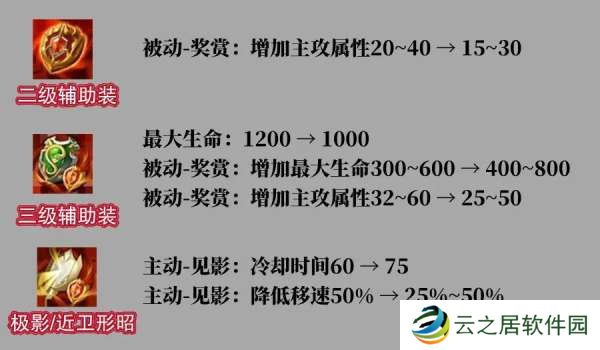①二级辅助装主攻属性加成:前期下调5点、满级下调10点
