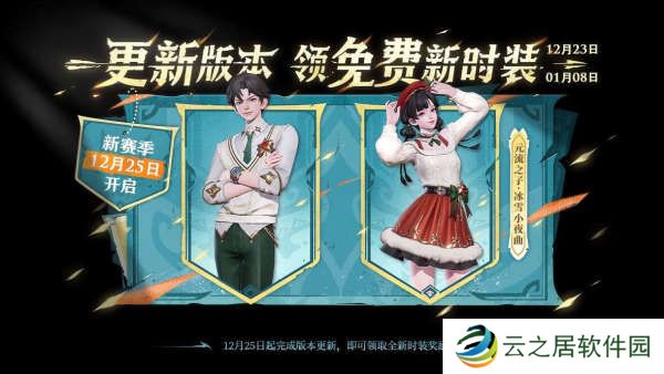 在新赛季元流之子这个英雄也有好消息,这个英雄将会在新赛季更新之后陆续推出好几套全新的装扮。如下图所示,25号更新之后,玩家就可以领取一套冰雪小夜曲装扮,如下图所示。