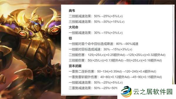 二技能减速从30%调整至15%-30%,大批量英雄减速技能削弱,马超会成为最大受益者之一。