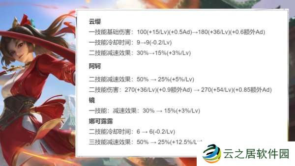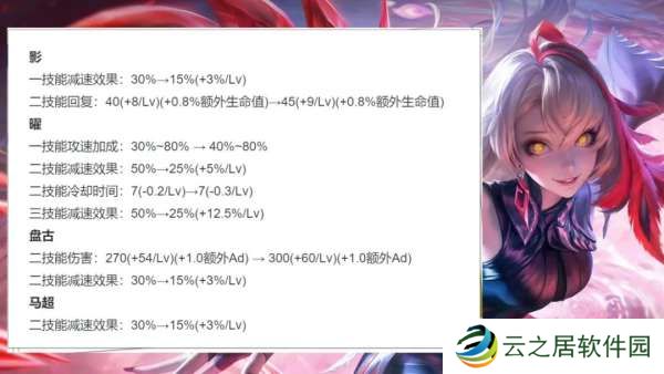 二技能减速从30%调整至15%-30%,一技能伤害上调基础数值、AD改为额外AD加成,满级一技能缩短1秒。