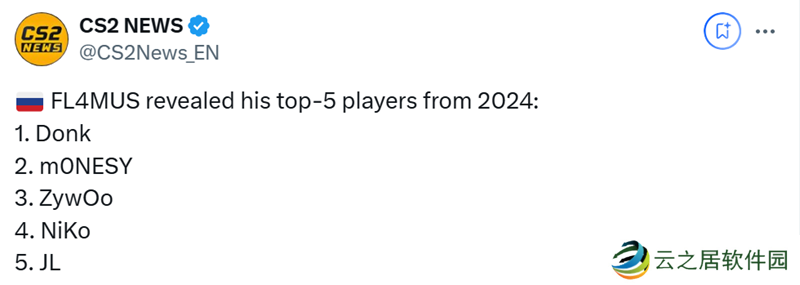 GamerLegion战队选手FL4MUS在社交媒体平台上分享了自己的2024年度Top5选手预测: