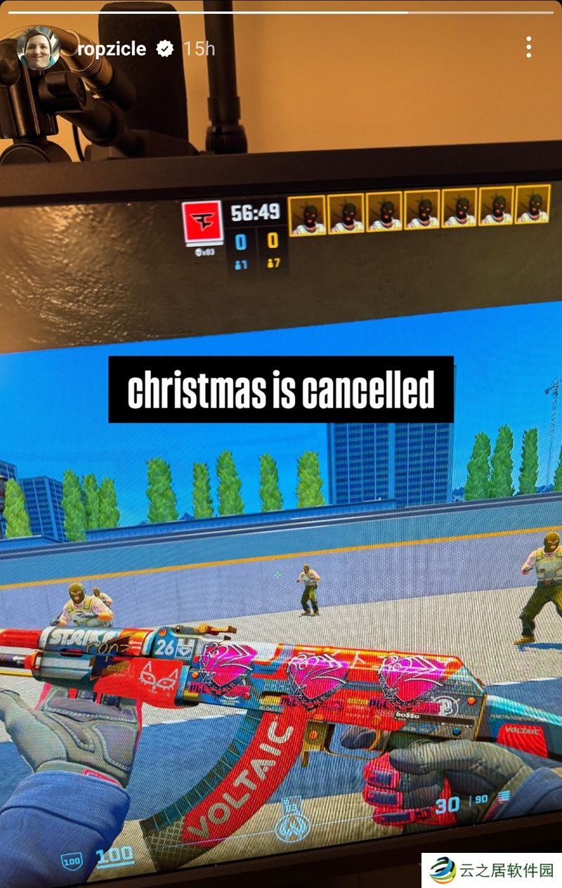 FaZe战队选手ropz在社交频道中发布动态,内容是他手持贴有自己印花的AK47在练枪地图中的画面,同时ropz也写道:圣诞节取消。