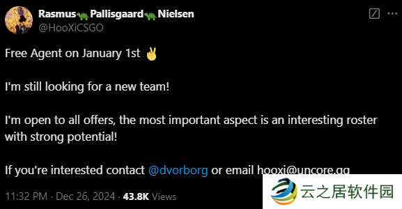 “从明年1月1日开始成为自由选手,我仍在寻找新队伍!我对所有的工作都持开放态度,最重要的是队伍的阵容有趣且潜力强大!”
