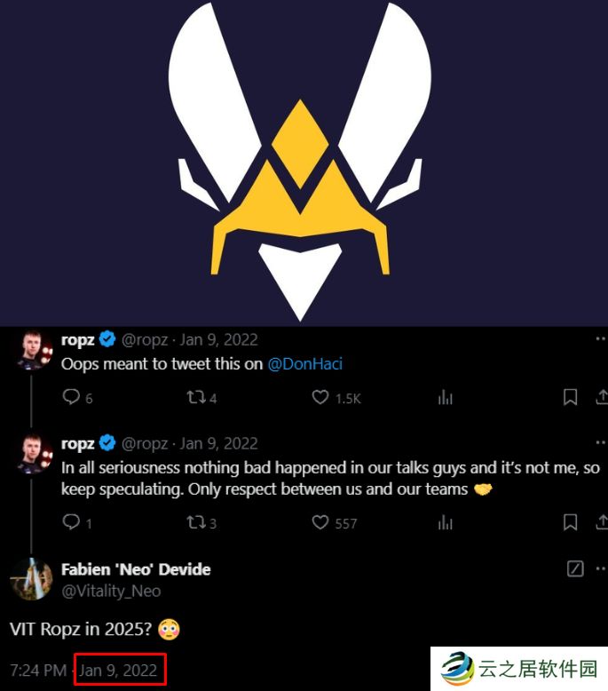 在2022年1月,ropz在推文中澄清了自己和Vitality之间的联系:“认真说,我们的谈话中没有发生任何不好的事情,这不是我的问题,所以继续猜下去吧。我们之间以及我们团队之间只有相互尊重。”