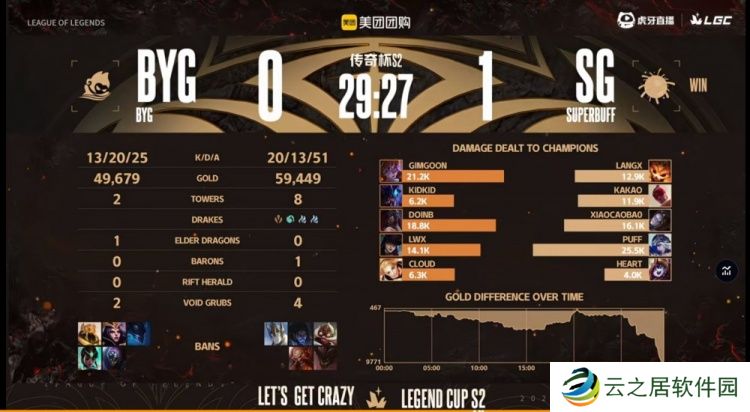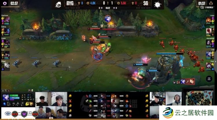 第一局比赛开局BYG下路组想干扰Kakao盲僧打野结果自己直接爆炸,SG前期拿下经济和资源的优势,小龙也给到BYG压力!中期BYG依靠两波打团一度拉回经济差!关键龙魂团Kakao盲僧单防Doinb阿卡丽,SG追击打出1换4,拿下风龙魂+大龙之后依靠Langx大纳尔绕后留住BYG两人,SG在下路二塔团战团灭BYG,一波赢下首局!