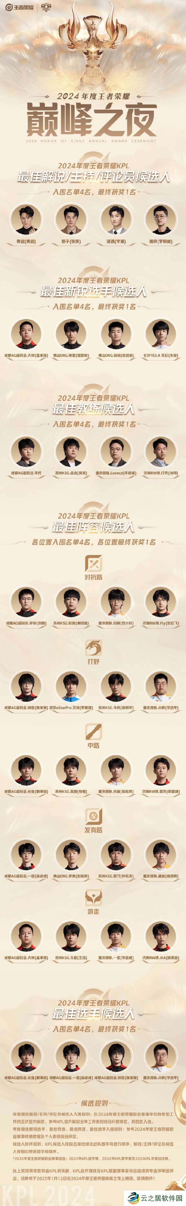 2.年度最佳新锐选手、最佳教练、最佳阵容、最佳选手入围规则:参考2024年度王者荣耀职业赛事成绩数据及个人表现综合评定,2024年度王者荣耀职业赛事包含:2024年KPL春季赛、2024年KPL夏季赛及2024KPL年度总决赛