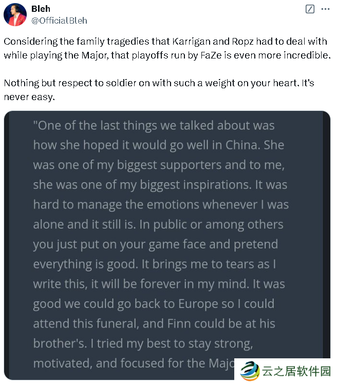 Bleh:考虑到karrigan和ropz在参加Major比赛期间所遭遇的家庭悲剧,FaZe的淘汰赛表现更加令人难以置信。对于在如此沉重的心情下继续前行的他们,我深感敬意。这绝非易事。