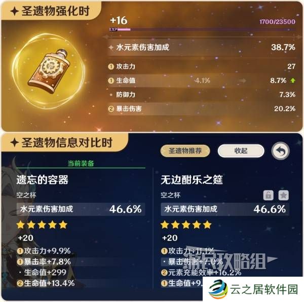 除此之外,为了进一步帮助大家节省计算成本,并快速判断圣遗物培养价值,版本更新后,强化圣遗物或使用对比查看圣遗物信息时,将能够直接了解追加属性的强化次数。推荐属性高亮配合强化次数标记,能够轻松获取角色圣遗物最优解。