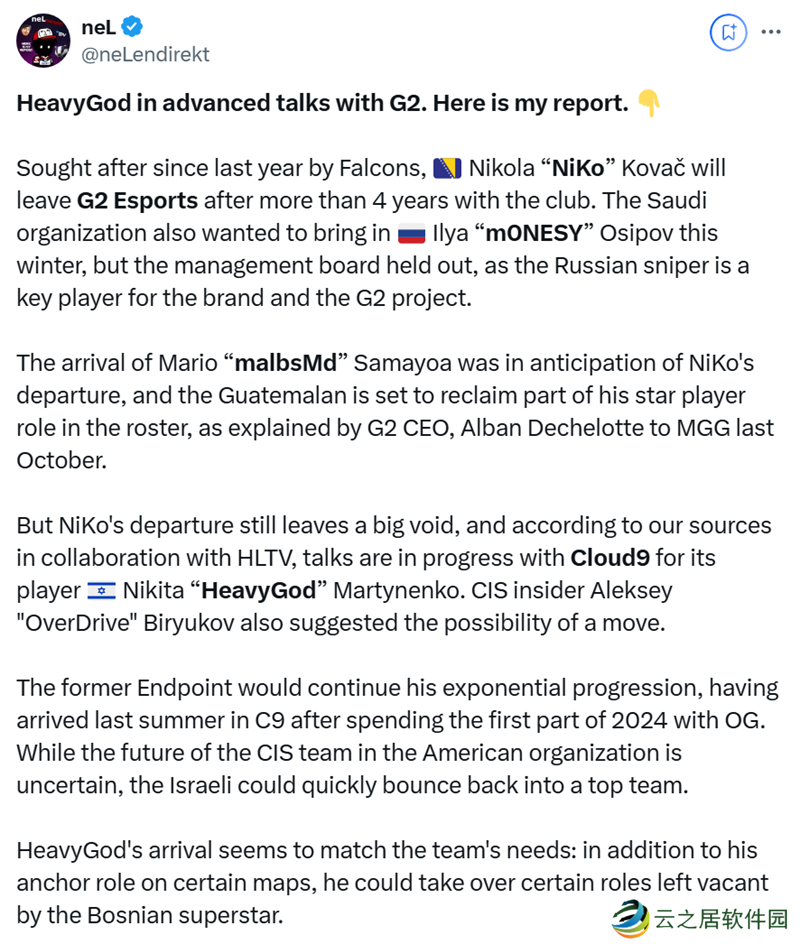 然而NiKo的离开仍留下了巨大空缺。据我们与HLTV合作获取的消息源称,G2正在与Cloud9就其旗下以色列选手HeavyGod的转会进行谈判。独联体地区的爆料人OverDrive也暗示了这一转会的可能性。