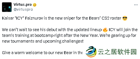 我们迫不及待地想要看到他在新阵容中的首秀, ICY将在新年后正式加入团队,并在训练基地中与队友们一起集训。我们正在为新的比赛和即将到来的挑战做好准备!”