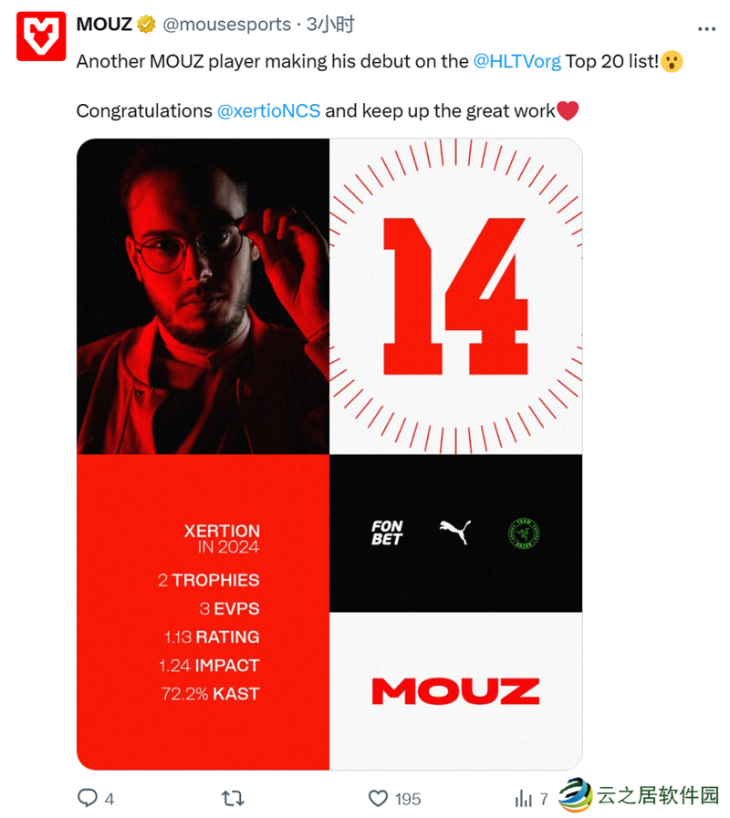 MOUZ官推:又一位MOUZ选手在职业生涯中首次进入Top20行列,祝贺xertioN,继续努力吧。