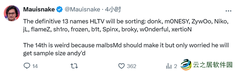 Mauisnake:HLTV将梳理的13个确定名字排名——donk、m0NESY、ZywOo、NiKo、jL、flameZ、sh1ro、frozen、b1t、Spinx、broky、w0nderful、xertioN。