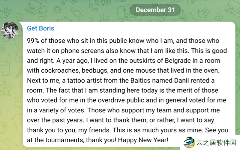 “在座99% 的人都知道我是谁,在手机屏幕前观看的朋友们也了解我。这样很好,也理应如此。一年前,我还住在贝尔格莱德市郊,房间里有蟑螂、臭虫,还有一只住在烤箱里的老鼠。旁边住着一位来自波罗的海地区、名叫Danil的纹身师,他也租了个房间。我今天能站在这里,多亏了在OD社群为我投票的人,以及在各种投票中支持我的人。感谢过去这些年一直支持我和我战队的你们。我想感谢他们,确切地说,我想对你们说声谢谢,我的朋友们。成就既是我的,也是你们的。赛场上见,谢谢大家!新年快乐! ”