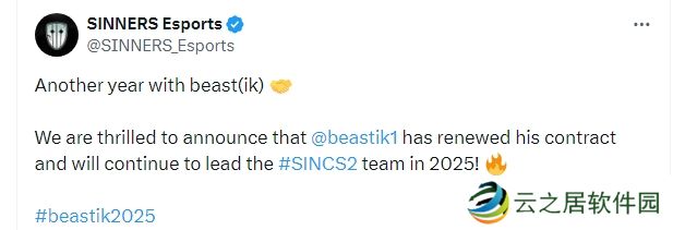 “又一年与beast(猛兽)ik同行,我们很高兴地宣布与beastik完成续约,他将在2025年继续带领SINNERS战队前行!”