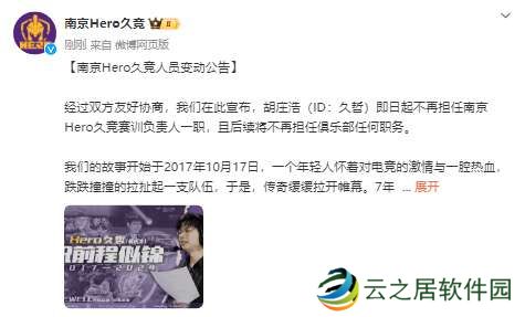 经过双方友好协商,我们在此宣布,胡庄浩(ID:久哲)即日起不再担任南京Hero久竞赛训负责人一职,且后续将不再担任俱乐部任何职务。