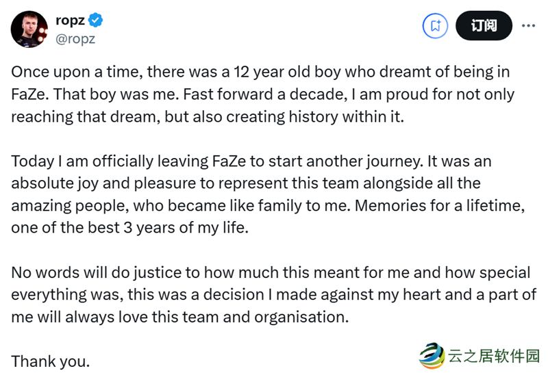 今天我正式离开FaZe,开启另一段征程。能与所有出色的伙伴一起代表这支战队,实在是莫大的快乐与荣幸,他们对我而言就像家人一样。这是一生中难忘的回忆,也是我人生中最美好的三年。