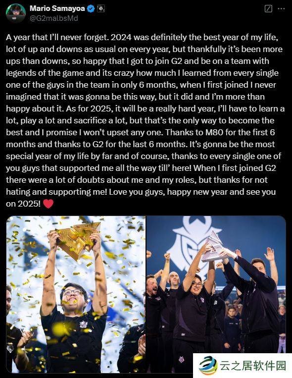 “这是我永生难忘的一年。2024年绝对是我人生中最美好的一年,像往常一样,每年都会有很多起伏,但值得庆幸的是,这一年里喜多愁少。我很高兴能加入G2战队,与CS的传奇选手们同在一支战队效力,在短短6个月的时间里,我从战队的每个人身上学到了很多东西,这太疯狂了。