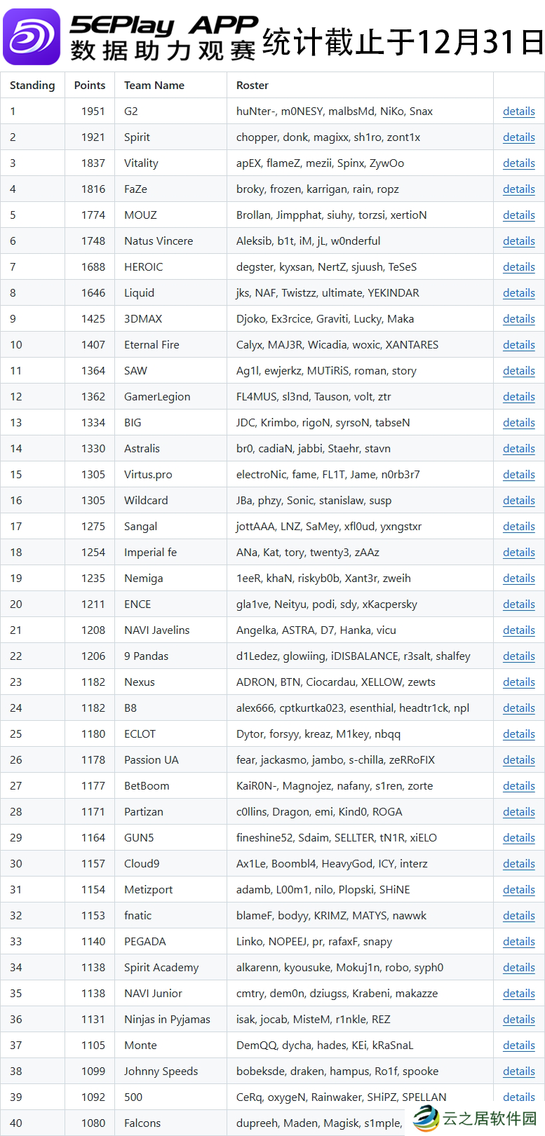 昨日V社更新了旗下CS世界排名,这一世界排名即是2024年各队伍的最终积分,也是新一年每支队伍的起始积分。由于近期处于冬季转会期,部分队伍的排名将会在之后迎来较大变动。