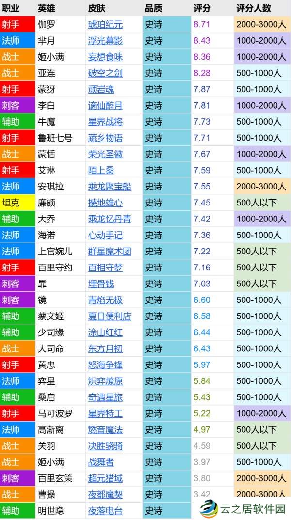 2024年共上架31款史诗皮肤,平均分仅有6.6分。星界战将的分数在其中排名第七,略高于鲁班战令蔬乡物语。