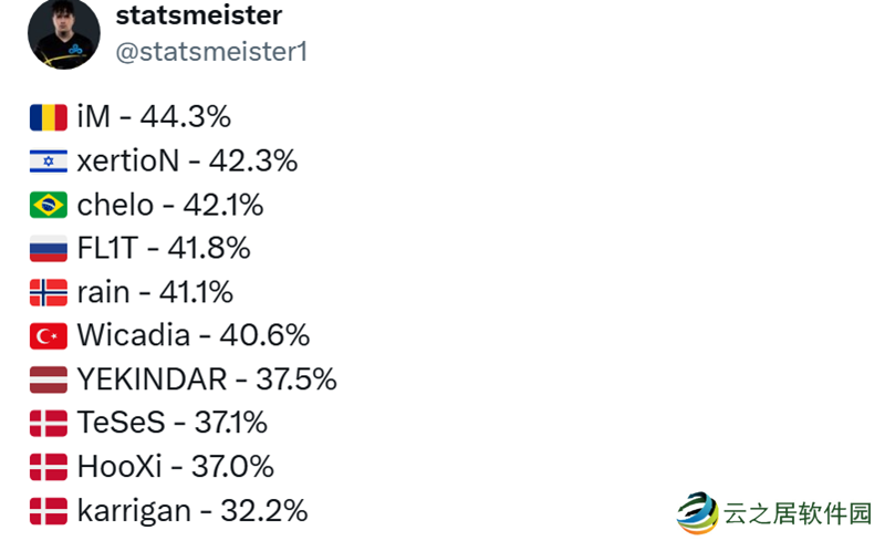 排在第一的是土耳其狠人XANTARES,他在105张地图上首杀尝试率为30.1%,而最终的成功率为53.4%。